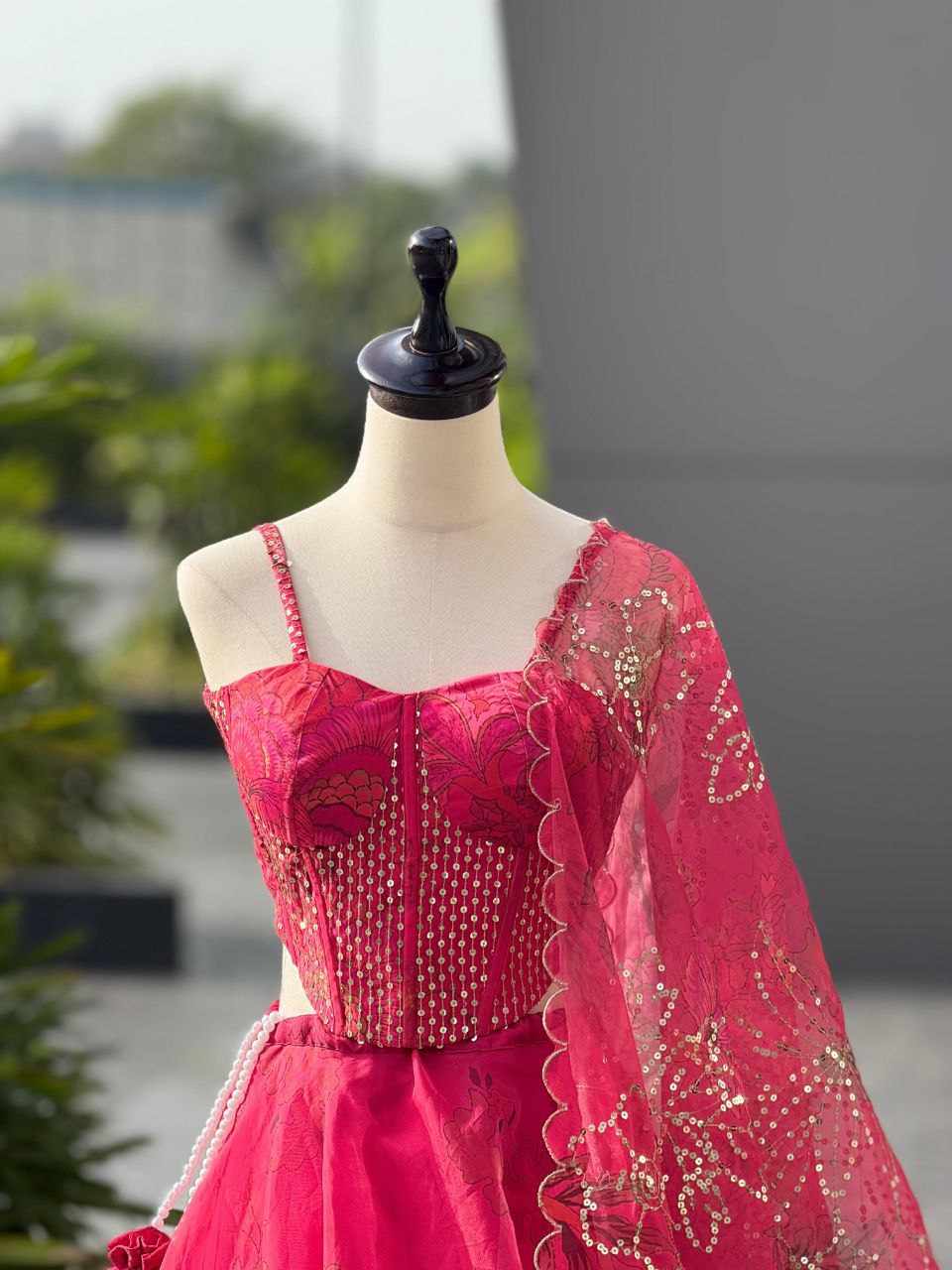 Blouse – Pure organza corset pattern blouse with embroidery and sequence work. Fully stitched, padded size 38 with margin given for alterations.