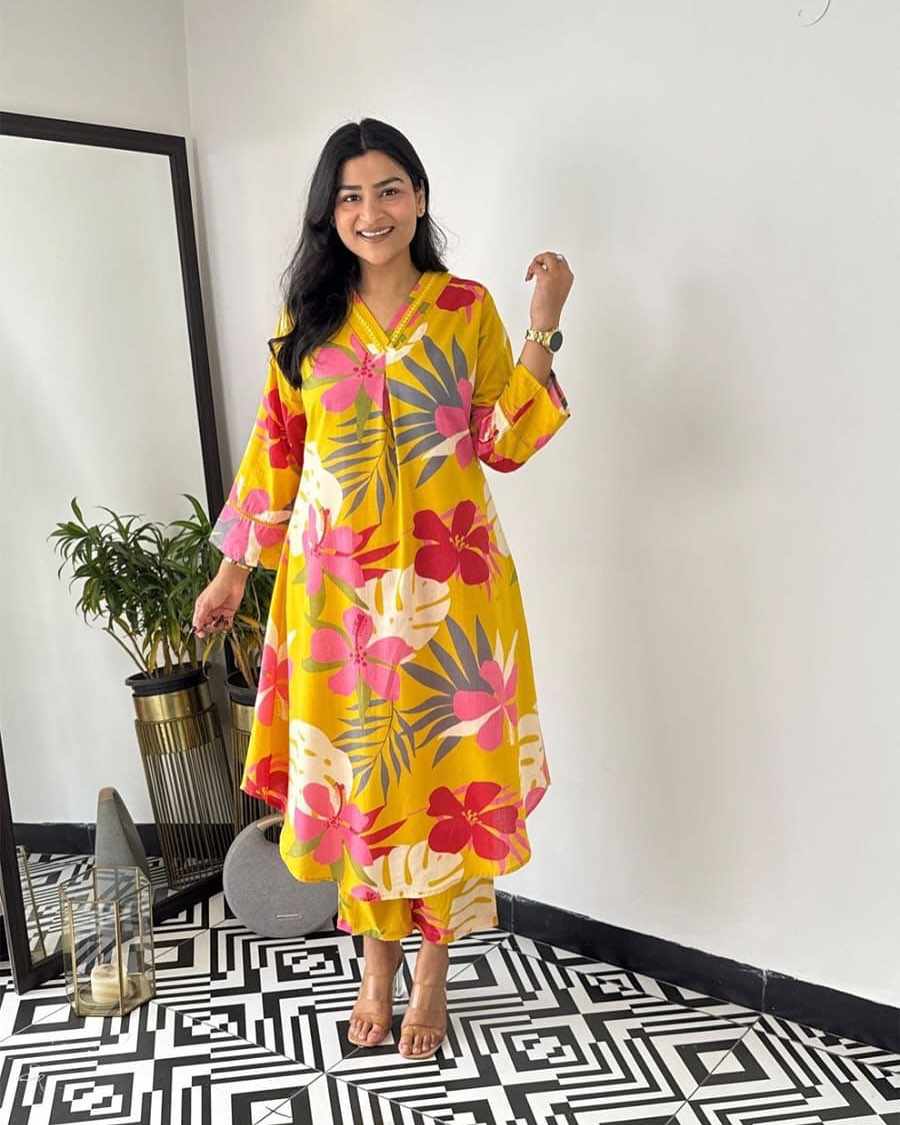 SF 2JU Yellow Beautiful Best Cotton Printed Cord Set Dress 717